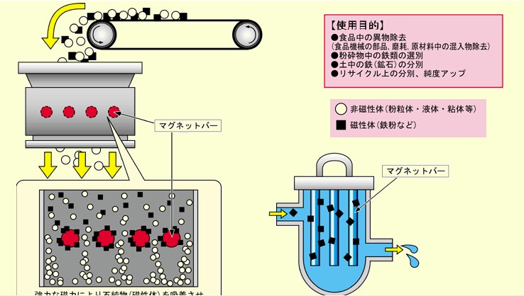 ● 機械の丸型原料投入口や、出口部分に設置し除鉄します。